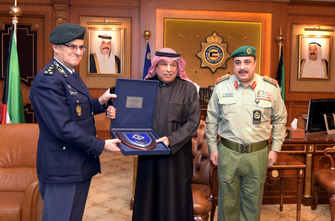 | استقبل معالي الفريق م./ الشيخ خالد الجراح الصباح نائب رئيس مجلس الوزراء ووزير الداخلية في مكتبة بمقر وزارة الداخلية اليوم الاثنين 22/1/2018الفريق ركن / مانويل كوتو القائد العام للحرس الوطني الجمهوري بالجمهورية البرتغالية بحضور وكيل الحرس الوطني الفريق ركن مهندس /هشام عبد الرزاق الرفاعي و وكيل وزارة الداخلية المساعد لشئون العمليات اللواء جمال حاتم الصايغ. وقد رحب معاليه بضيفه متمنيا له طيب الإقامة بدولة الكويت وخلال اللقاء تبادل الأحاديث الودية ومناقشة عدد من الموضوعات ذات الاهتمام المشترك، كما تم بحث سبل التعاون وتبادل الخبرات بين دولة الكويت والجمهورية البرتغالية. واكد معاليه على عمق العلاقات الكويتية البرتغالية وتوافق الرؤى حول كثير من القضايا الإقليمية والدولية وأهمية تعزيز هذه الروابط بما يخدم مصلحة البلدين. ومن جانبه أعرب الفريق ركن مانويل كوتو عن شكره لدولة الكويت على كرم الاستقبال وحسن الوفادة، مؤكدا على اهتمام بلاده لتعزيز من التعاون مع دولة الكويت مشيدا بدور الكويت البارز في تعزيز الأمن والاستقرار في المنطقة وفي نهاية اللقاء تم تبادل الدروع التذكارية بين الجانبين. |